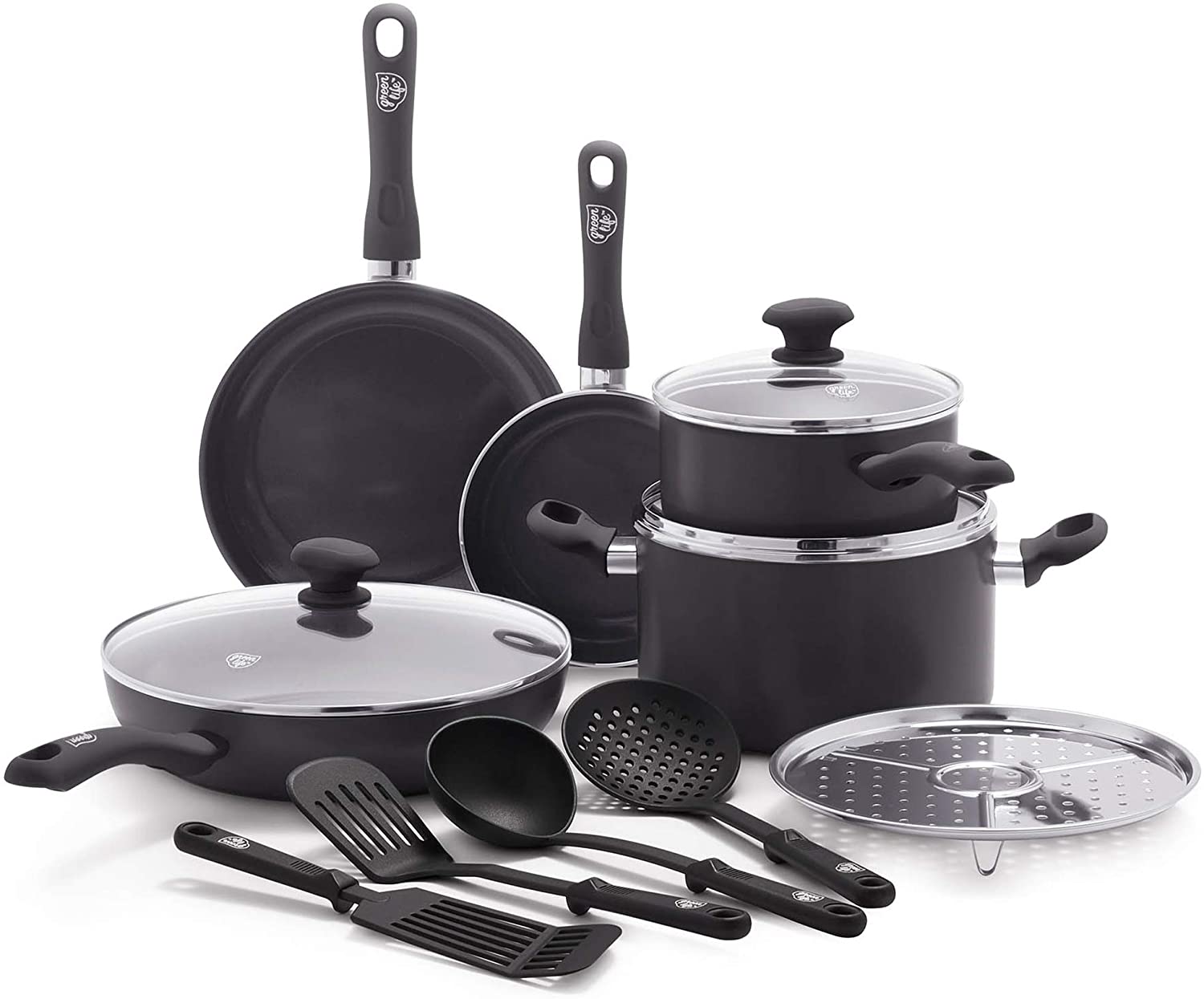 This is an excellent cookware set for those who are looking for an inexpensive option that has all of the basic pieces that you need. The set includes a 7'' & 9.5'' frying pan/skillet, 2qt saucepan with lid, 3.8qt sauté pan with lid, 5qt casserole/stockpot with lid, 7” stainless steel steamer plate, nylon ladle, nylon slotted turner, and two spatulas. The pots and pans are made from recycled aluminum and have tough, diamond-reinforced nonstick coating that is also healthy and free of PFAS, PFOA, lead, and cadmium. The clear glass lids are oven safe up to 350°F and the set is dishwasher safe.