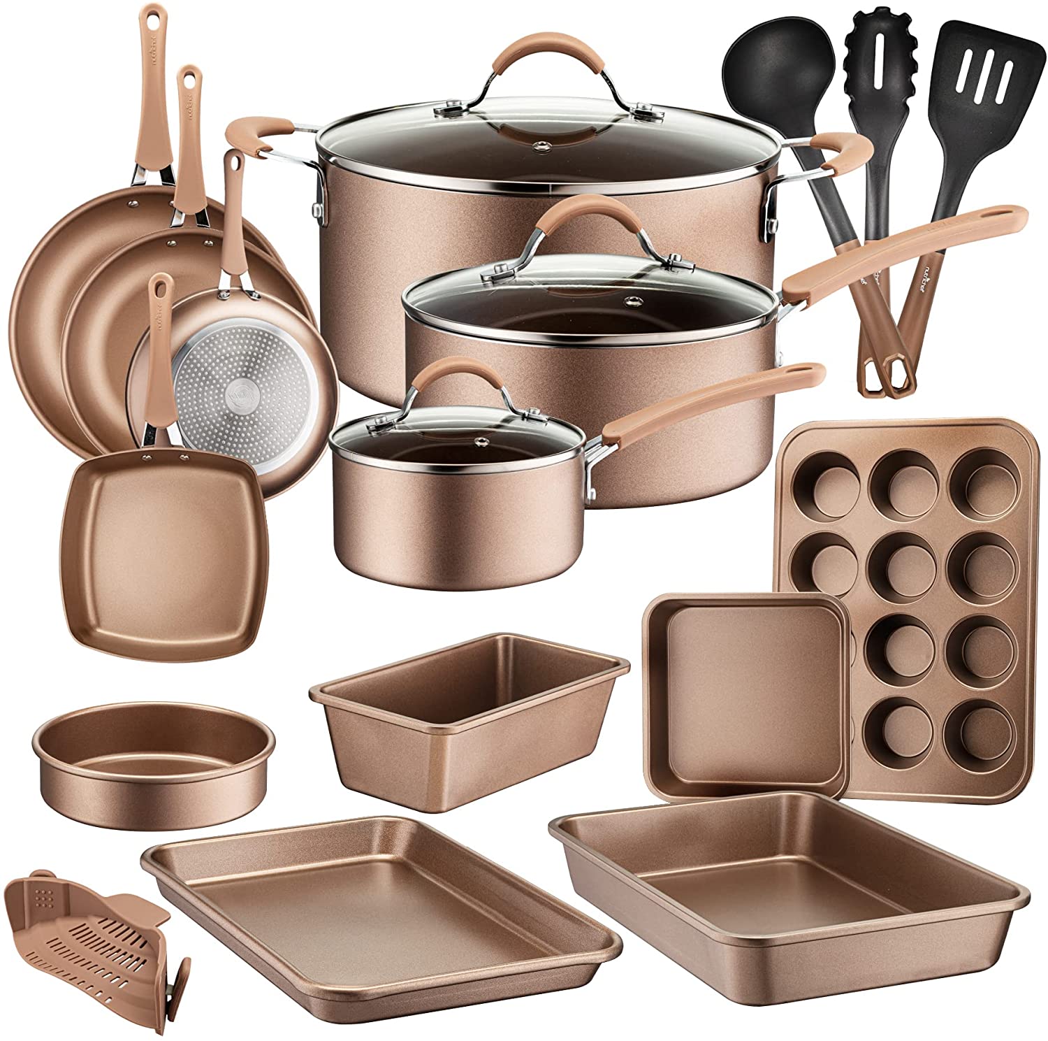 Best Pro: 20-Piece Nonstick Kitchen Cookware Set - PTFE/PFOA/PFOS-Free Heat Resistant Kitchen Ware Pots Baking Pan Set w/ Saucepan, Frying Pans, Cooking Pots, Oven Pot, Lids, Matt Gold NutriChef