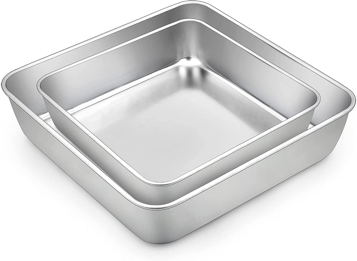 Best Budget: TeamFar Square Cake Pan, 8 / 9 Inch Stainless Steel Square Baking Pan for Cake Brownie Lasagna, Non-Toxic & Heavy Duty, One Piece Design & Deep Wall, Smooth & Dishwasher Safe – Set of 2